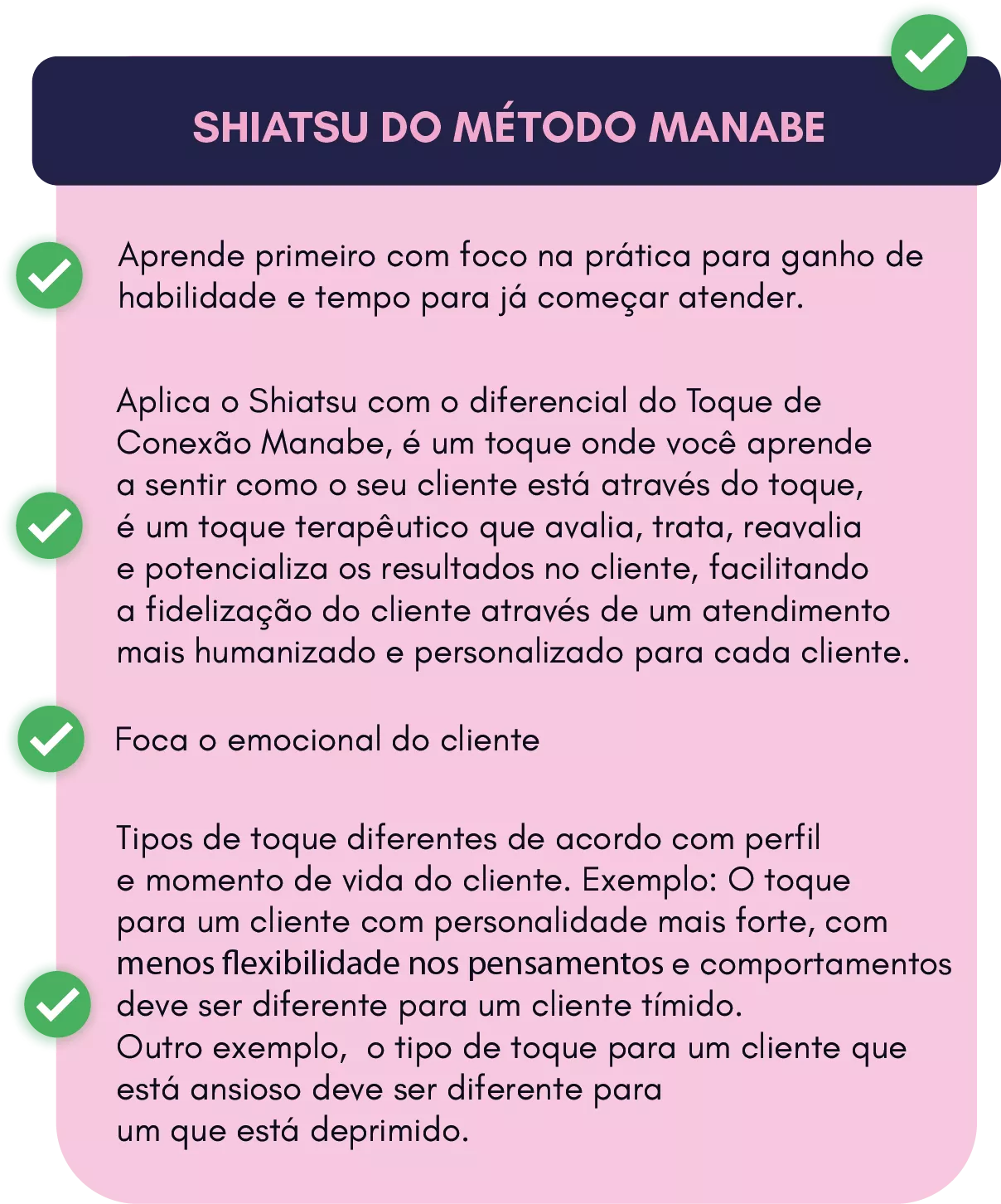 Aqui você aprende o Shiatsu do zero, sabendo aplicar o Toque de Conexão Manabe, um toque que sente, que potencializa os resultados, que permite avaliar, tratar e reavaliar o cliente, é um toque mais humanizado, mais personalizado, para fidelizar mais naturalmente, mais facilmente o cliente, para dar mais resultados. Cada ser humano é único e vive dificuldades e momentos diferentes na vida, e quando o toque é de acordo com o perfil e momento de vida do cliente, naturalmente os resultados que entrega também são outros.