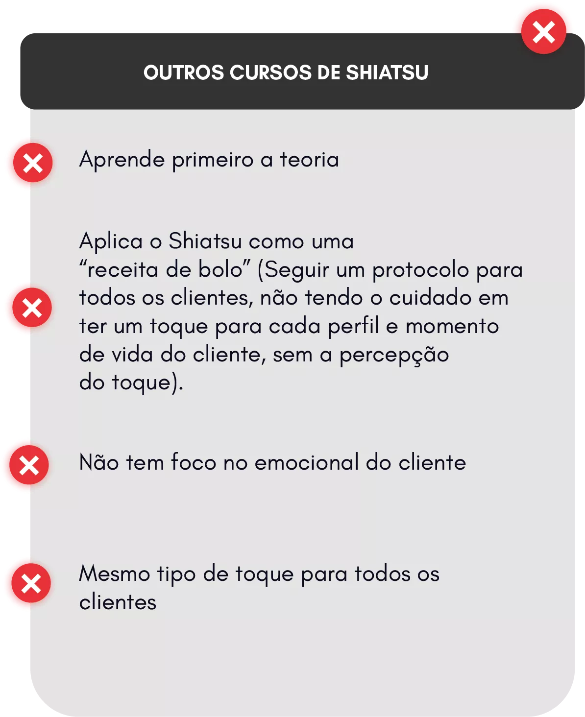 Vai aprender a fazer o Shiatsu de acordo com o pefil e momento de vida do cliente, vai aprender a atuar dentro do físico, emocional, mental, comportamental e energético do cliente, entregando resultados mais transformadores ao cliente.